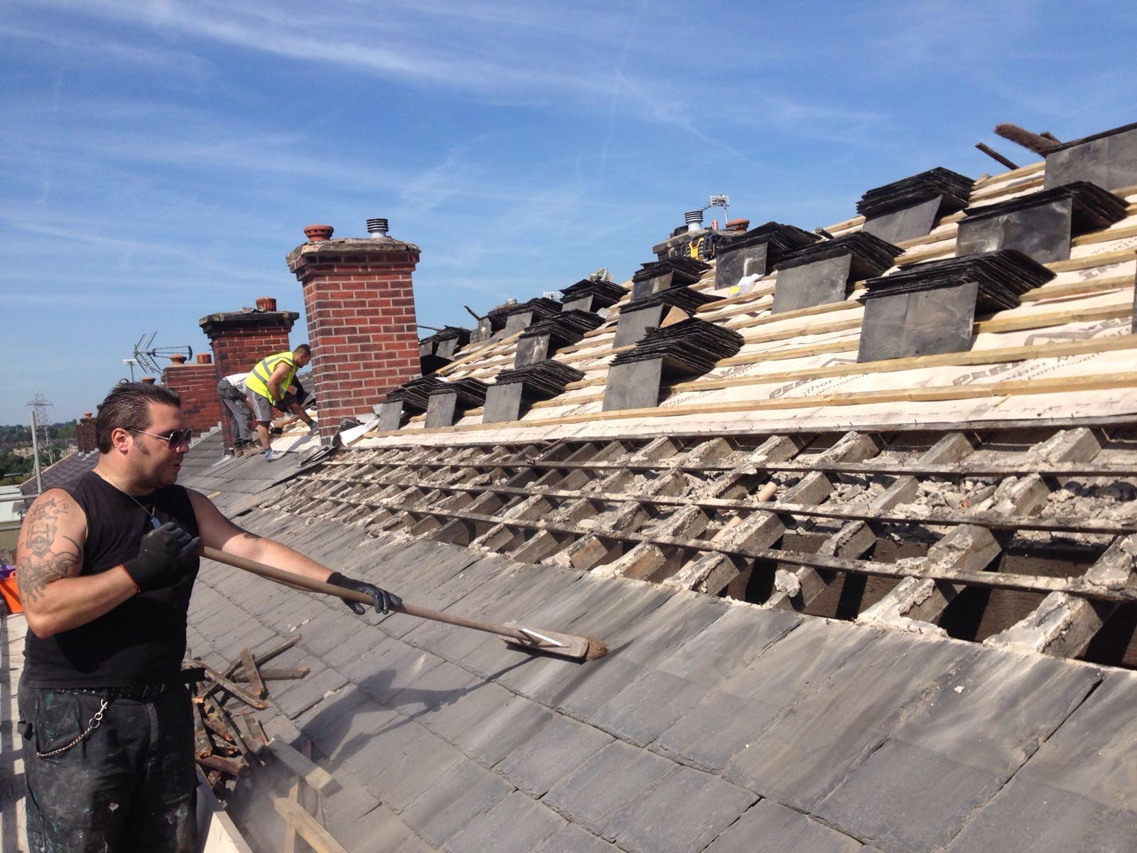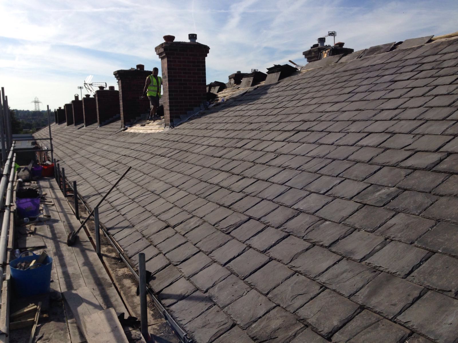 We acompleted a comprehensive roofing project on three houses in a row, which involved re-slating the roofs, installing new felt, and fitting new battens. This process began with carefully removing the existing slates to ensure minimal disruption and damage to the underlying structure. Once the old materials are removed, we laid down a fresh layer of high-quality felt to provide waterproofing and protect against the elements. Next, we installed new battens to create a solid framework for the re-slating process. Finally, we carefully replaced the old slates with durable, weather-resistant new slates, ensuring a uniform and aesthetically pleasing finish across all three properties. This upgrade not only enhances the appearance of the homes but also significantly improves their durability and resistance to weather, extending the lifespan of each roof.